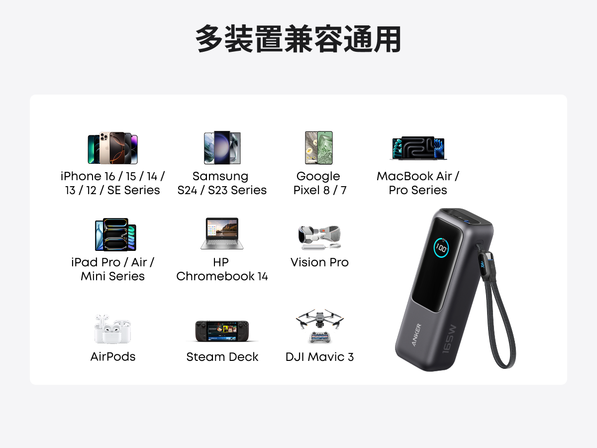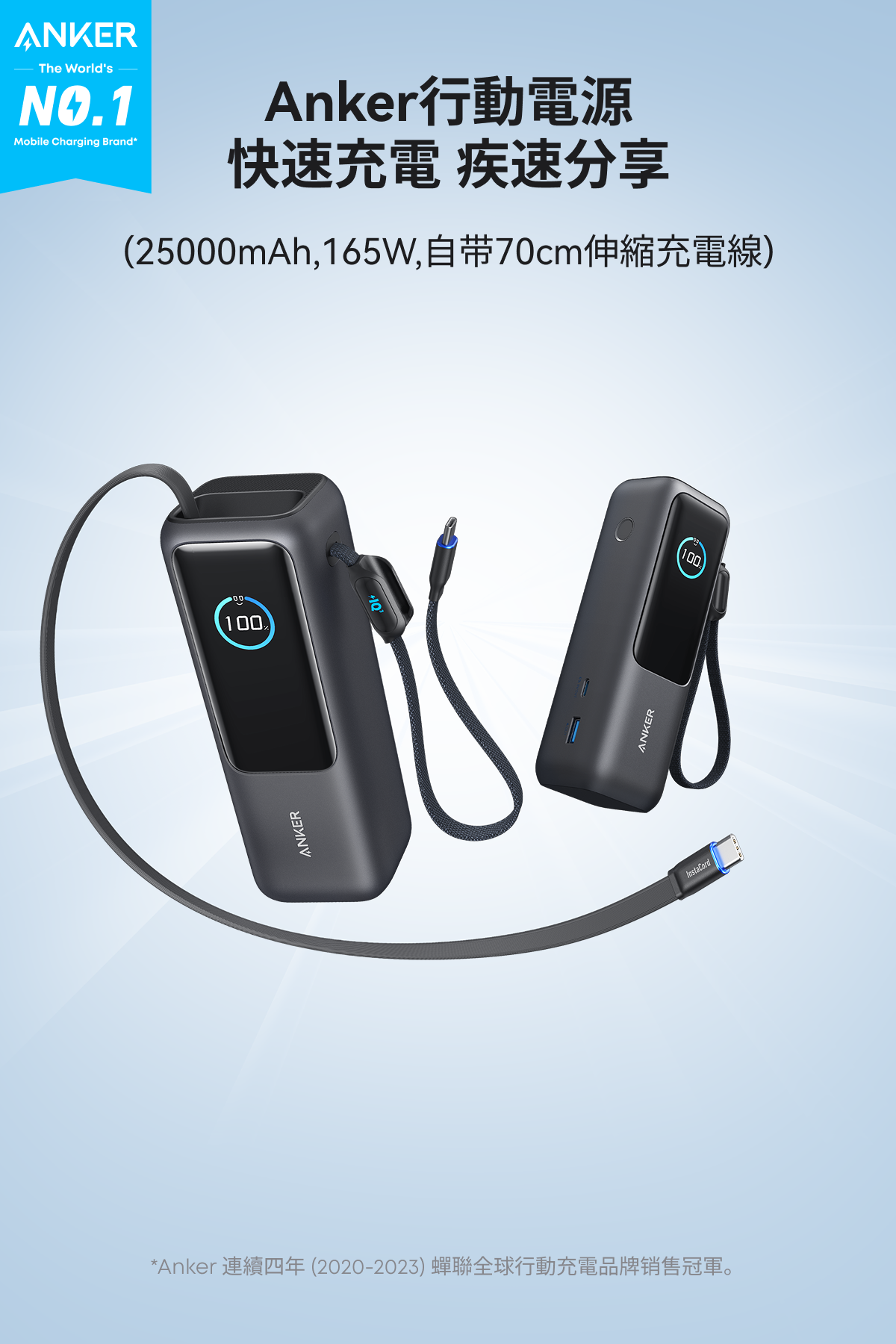 【ANKER】行動電源 25000mAh 165W 自帶伸縮線 A1695