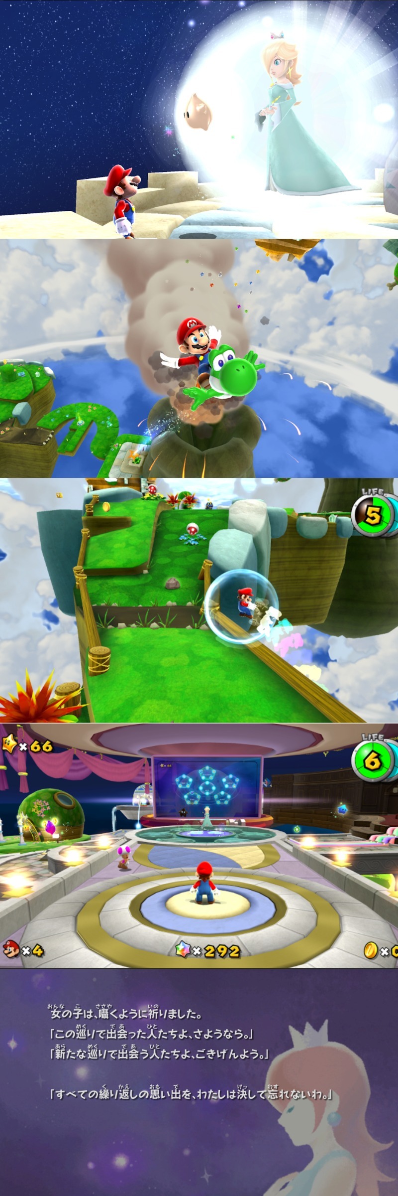 背景是一望無際的宇宙,在《超級瑪利歐銀河》中,瑪利歐借助羅潔塔和奇可的力量在銀河間穿梭;在《超級瑪利歐銀河 2》中則是和奇可、耀西一起飛向銀河。