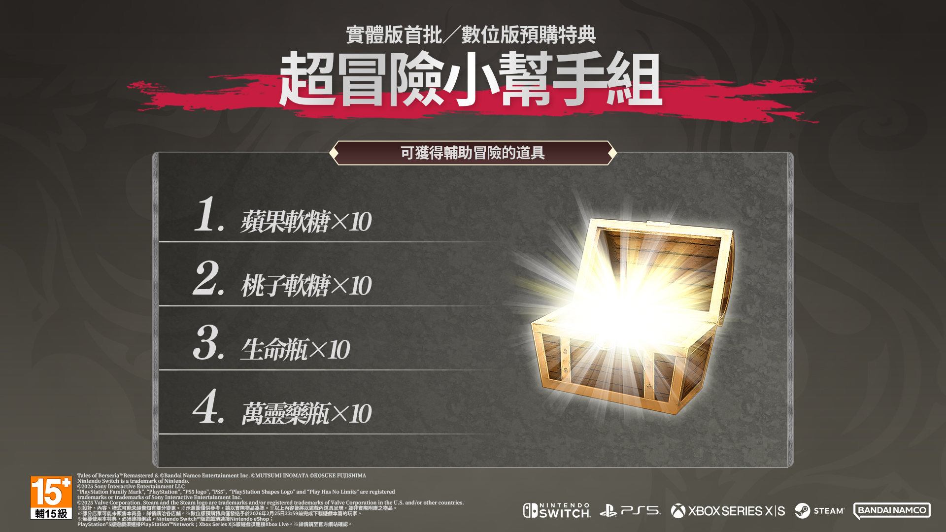 首批購買實體版的玩家將可獲得包含軟糖及生命瓶等回復道具的特典「超冒險小幫手組」。